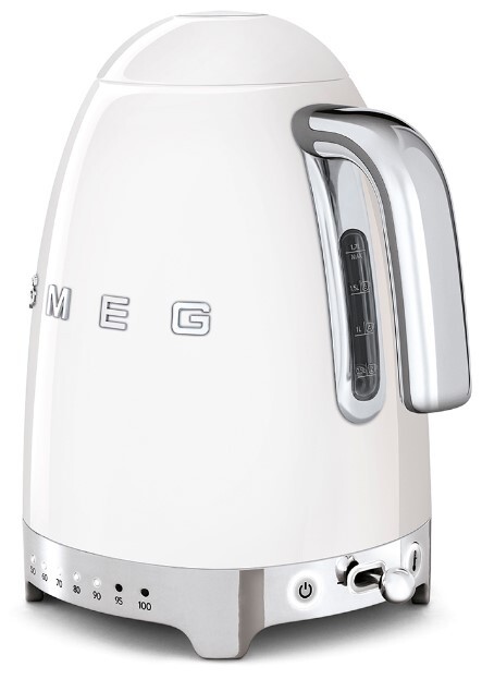Smeg KLF04WHEU — электрический чайник в универсальном белом цвете. Устройство органично смотрится с остальными приборами из серии «стиль 50-х». Стальной фильтр, расположенный внутри конструкции, легко снимается для очистки, не подвержен коррозии. Автоматическое отключение устройство происходит во время достижения нужной температуры, а также при снятии с базы.