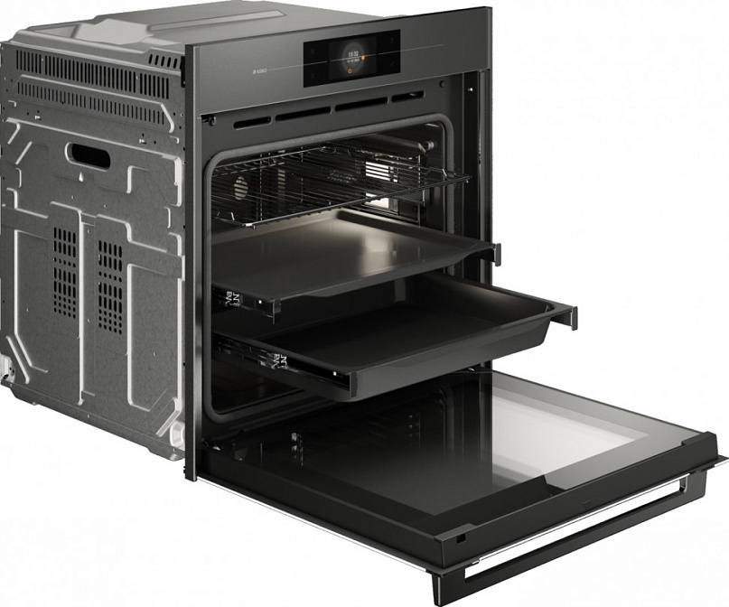3 эмалированных противня, 2 набора для приготовления на пару, Телескопические направляющие: полного выдвижения с фиксатором, Боковые профили для бесшовного монтажа