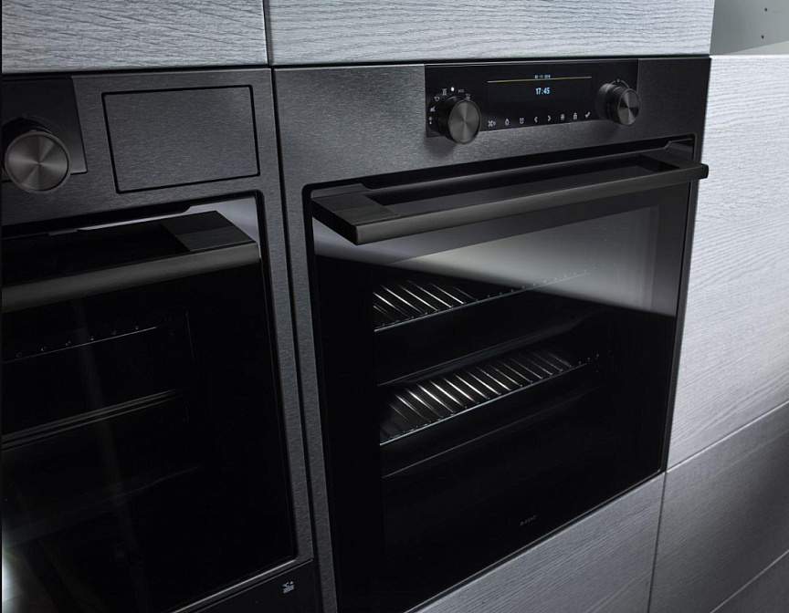 Цельная фасадная рама для уникального монтажа, Сдвоенный верхний нагревательный элемент, Эргономичная ручка выбора программ, Ручка jog-dial для установки параметров, Пошаговое приготовление, Цвет: Black Steel
