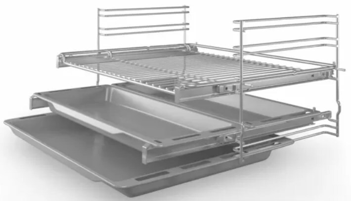 Шкаф оснащен защитой от детей, что делает его безопасным для использования в семьях с маленькими детьми. Стекла дверцы шкафа состоят из двух слоев, что обеспечивает их прочность и надежность. В комплект поставки входит комбинированная решетка, универсальный противень и два узких противня.