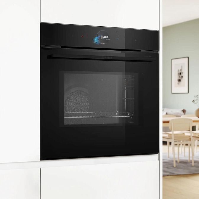 Духовой шкаф Bosch HNG978QB1 объединяет современный дизайн и функциональность. Полезный объем 67 литров позволяет готовить сразу несколько блюд, а компактные размеры упрощают установку. Сенсорное управление и TFT-дисплей делают работу с устройством удобной и понятной. В арсенале модели 28 режимов нагрева, включая подогрев, тушение, пиццу, сушку, размораживание, приготовление на пару и подъем теста. Технология 4D HotAir равномерно распределяет тепло, предотвращая смешивание запахов при одновременной готовке на нескольких уровнях. Для точного контроля предусмотрены датчик PerfectBake и многоточечный термощуп PerfectRoast. Пиролитическая очистка облегчает уход, LED-подсветка улучшает обзор, а система SoftClose обеспечивает плавное закрывание дверцы. В комплект входят решетка и несколько видов противней, а уровень безопасности повышают блокировка от детей и охлаждающая система.