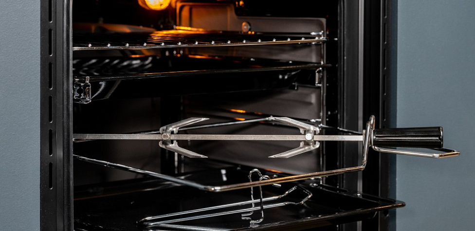 Духовой шкаф, Универсальный противень, Глубокий противень, Поддон для жира, Решетка для жарки, Вертел, Документация