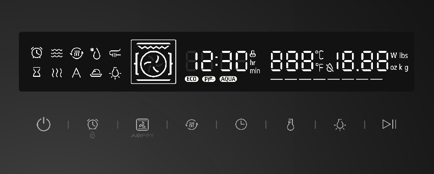 Большой гриль, Горячий воздух, Конвекционный нагрев, Малый гриль, Нижний нагрев, Объемный турбогриль, Пицца, Размораживание, Расстойка теста, Верхний + нижний нагрев, ECO-режим