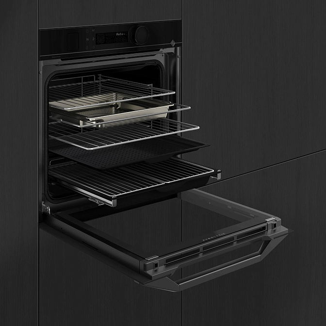 Духовой шкаф, Безопасная решетка - 1 шт, Складная решетка - 1 шт, Противень глубиной 45 мм - 1 шт, Противень для приготовления на пару - 1 шт, Противень глубиной 8 мм - 1 шт, Перфорированный противень (Airfry) 20 мм - 1 шт, Документация