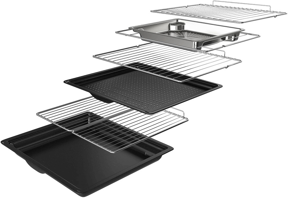 Духовой шкаф, Безопасная решетка - 1 шт, Складная решетка - 1 шт, Противень глубиной 45 мм - 1 шт, Противень для приготовления на пару - 1 шт, Противень глубиной 8 мм - 1 шт, Перфорированный противень (Airfry) 20 мм - 1 шт, Документация