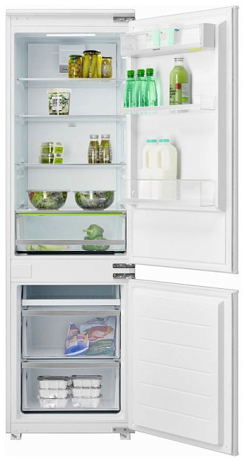 Встраиваемый двухкамерный холодильник Graude IKG 180.3 выполнен в стиле универсальный (требуется навеска фасада), имеет классический форм-фактор. Цвет фронтальной поверхности — белый. Дверной упор располагается в правой части агрегата. Этот встраиваемый прибор станет оптимальным решением для качественного хранения продуктов. Высота модели составляет 177 см, ширина — 54 см, глубина — 54 см. Холодильная камера просторная и вместительная, в ней есть полки, которые можно менять по высоте. На дверце располагается несколько подвесных лотков для бутылок и консервов, а также ячейки для яиц и льда. Полезный объём камеры составляет 180 литров.