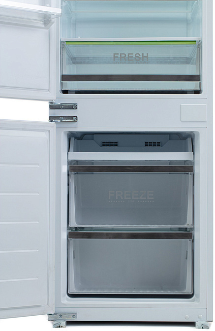Морозильный отсек находится в нижней части прибора, он состоит из трех вместительных пластиковых ящиков для продуктов. Разморозка этого отсека производится по технологии No Frost. Полезный объём камеры составляет шестьдесят семь литров. Оба отсека имеют внутреннее освещение, которое позволяет свободно разглядеть даже самые отдалённые уголки.