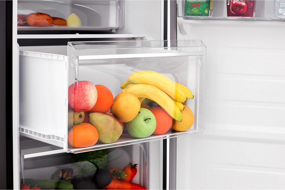 LED-подсветка, Держатель для бутылок, Выдвижной ящик зоны свежести, Выдвижной ящик с регулировкой уровня влажности