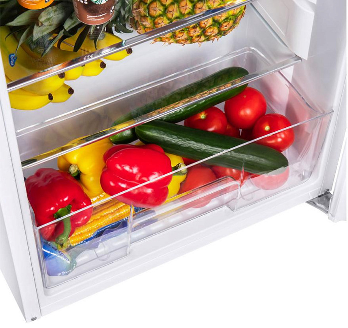 Цвет фронтальной поверхности — белый, отличает практичностью в уходе. Глянец легко очищается от разводов и отпечатков от рук. Высокий класс энергоэффективности A+ гарантирует экономичное потребление электроэнергии. В холодильной камере располагаются три регулируемые по высоте полки и одна фиксированная. Пользователь может создать идеальное пространство под свои запросы. Вместительный бокс для овощей и фруктов — снизу. Прочный пластик выдерживает большие нагрузки и отличается устойчивостью к образованию царапин. В морозилке — одна полка, что так же удобно для организации раздельного хранения продуктов. Автоматическое размораживание — одно из основных преимуществ. Внутри не образуется льда и снега, что обеспечивает комфорт при обслуживании прибора.