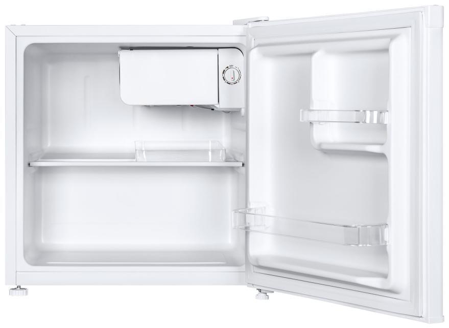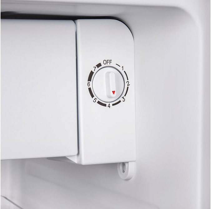 Внутри представлена одна прочная полка, которая выдерживает большие нагрузки, с фиксированным расположением. При этом ее можно убрать вовсе или выдвинуть для комфортного мытья. На дверце так же организованы две зоны, в которых удобно хранить бутылки и банки. Управление холодильником Манфилд MFF50W осуществляется при помощи поворотного регулятора, который отличается простотой в обращении. Внутреннее пространство освещает светодиодная лампа, которая включает при открытии прибора. Среди преимуществ модели — наличие в комплекте лотка для яиц. Для пользователя также доступна опция изменения стороны открывания — возможность перенавешивания дверцы.