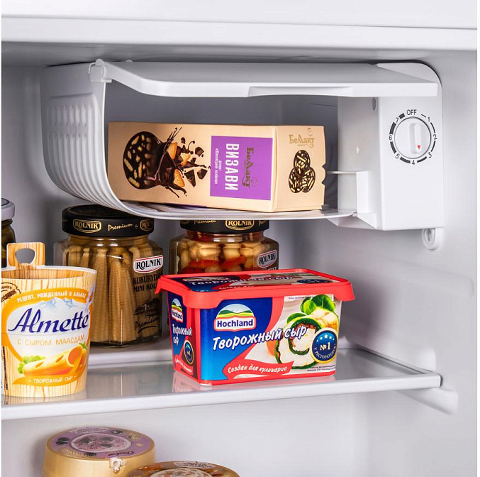 Внутри представлена одна прочная полка, которая выдерживает большие нагрузки, с фиксированным расположением. При этом ее можно убрать вовсе или выдвинуть для комфортного мытья. На дверце так же организованы две зоны, в которых удобно хранить бутылки и банки. Управление холодильником Манфилд MFF50W осуществляется при помощи поворотного регулятора, который отличается простотой в обращении. Внутреннее пространство освещает светодиодная лампа, которая включает при открытии прибора. Среди преимуществ модели — наличие в комплекте лотка для яиц. Для пользователя также доступна опция изменения стороны открывания — возможность перенавешивания дверцы.