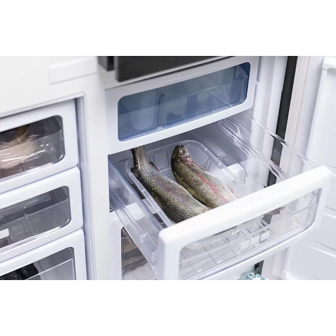Холодильник Sharp SJ FS97V BK выполнен в стиле современный, цвет фронтальной поверхности — черный. Этот отдельностоящий прибор станет оптимальным решением для качественного хранения продуктов. Высота модели составляет 183 см, ширина — 89.2 см, глубина — 77.1 см. Для фруктов и овощей имеется специальная зона свежести. Благодаря системе NoFrost на внутренних стенках не образуется льда и инеевого налета, поэтому такой агрегат не нужно размораживать вручную. Наличие льдогенератора, режима “Отпуск”, расширяет функционал модели. Высокий класс энергоэффективности A++ гарантирует экономичное потребление электроэнергии.