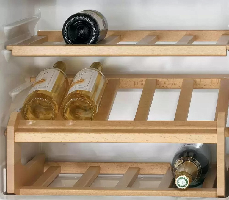 Side-by-Side, состоящий из 3 отделений: холодильник, морозильная камера, винный шкаф, Дверцы из нержавеющей стали, на которой не остаются отпечатки пальцев, 2 стеклянные прозрачные полки уменьшенной глубины, Большое отделение и стеклянная подставка для овощей