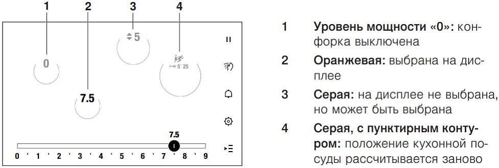 Свободное расположение посуды на всей поверхности прибора (до 6 предметов), Полноцветный сенсорный графический дисплей, 5 уровней яркости дисплея, Отображение даты с возможностью изменения, Переход на летнее время, Электронные часы, Уведомления с возможностью отключения, Функции: кипение на медленном огне, разделение конфорок, Технология GourmetGuide, Функция EcoManagement