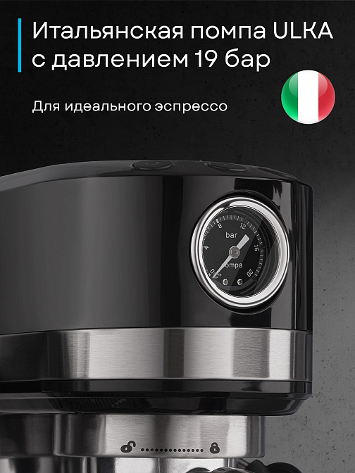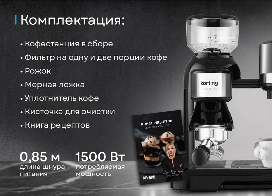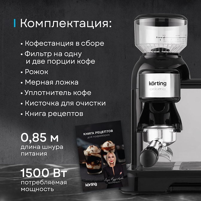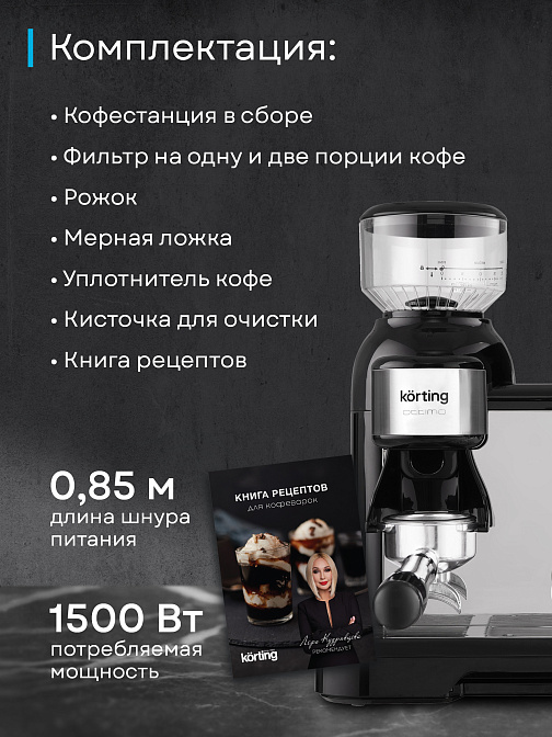 Кофеварка, Фильтр на одну и две порции кофе, Рожок, Мерная ложка, Уплотнитель кофе, Кисточка для очистки, Документация