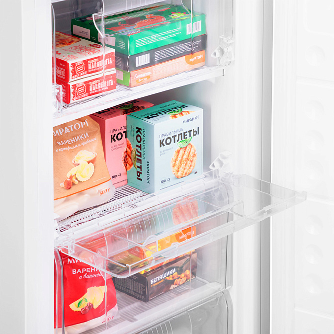 В морозильной камере Манфелд MFFR143W располагается четыре ящика и две полки. Через прозрачный пластик удобно просматривать содержимое боксов, поэтому не нужно выдвигать каждый в поисках необходимого продукта. Поворотный регулятор, при помощи которого устанавливается необходимый температурный режим находится сверху. Дверной упор справа, но пользователю доступна возможность перенавески. Морозильник с ручной системой разморозки. В комплектацию к прибору входит емкость для льда, что так же является преимуществом. Перед началом работы следует ознакомиться с инструкцией по эксплуатации, которая представлена на русском языке.
