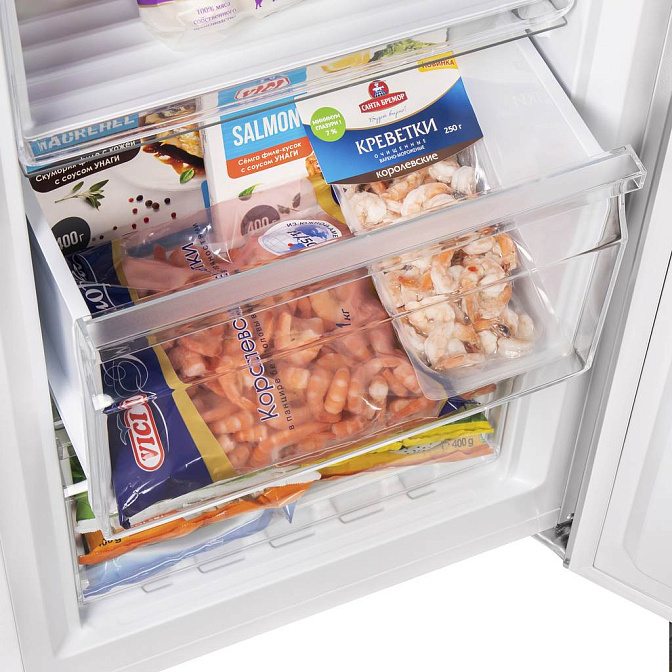 Внутреннее пространство морозильной камеры Манфелд MFFR170W содержит вместительные ящики и полки, как в основном отделении, так и на дверце, что позволяет организовать раздельное хранение продуктов. В комплектацию входит емкость для замораживания льда.
