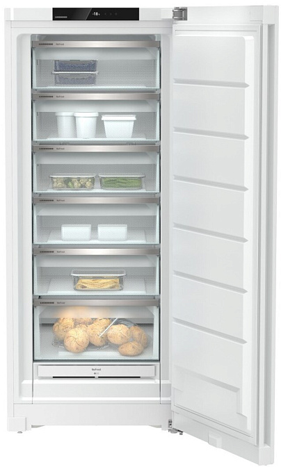 Морозильник Liebherr FNd 7026 оснащен системой No frost, она циркулирует холодный воздух не образуя льда на стенках устройства. VarioSpace позволяет вместить целый торт, благодаря регулированию внутренних контейнеров, вы можете вынуть их, чтобы освободить больше места. Функция SuperFrost позволяет заморозить свежие продукты и сохранив их полезные свойства, функция отключается самостоятельно через 65 часов.