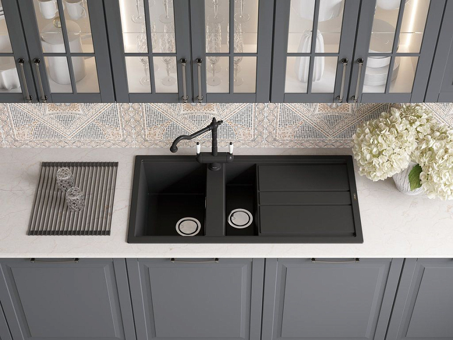 Мойка, Крепления для всех типов монтажа, Донный клапан, Сифон, Декоративный корзинчатый элемент, Слив, Перелив