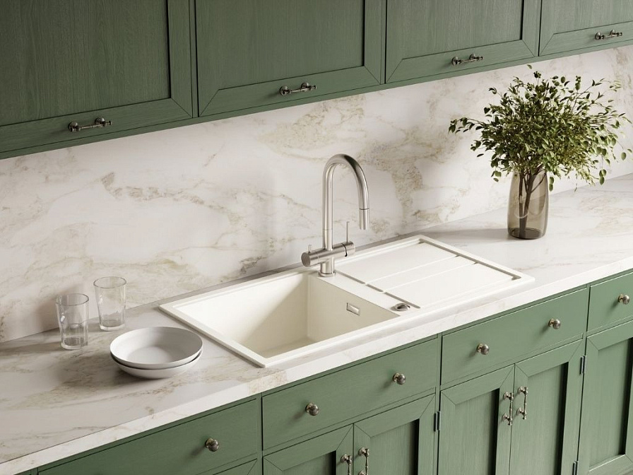 Мойка, Крепления для всех типов монтажа, Донный клапан, Сифон, Декоративный корзинчатый элемент, Слив, Перелив