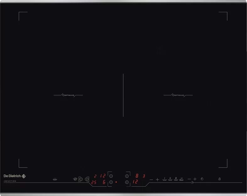 De Dietrich DTI 1053 X — индукционная варочная панель c двумя свободными зонами нагрева. Функция контроля Switch позволяет перемещать кастрюлю или сковородку на нужную конфорку с сохранением заданных параметров приготовления. При помощи режима Clean Lock можно заблокировать все элементы управления на одну минуту для безопасного выполнения чистки.
