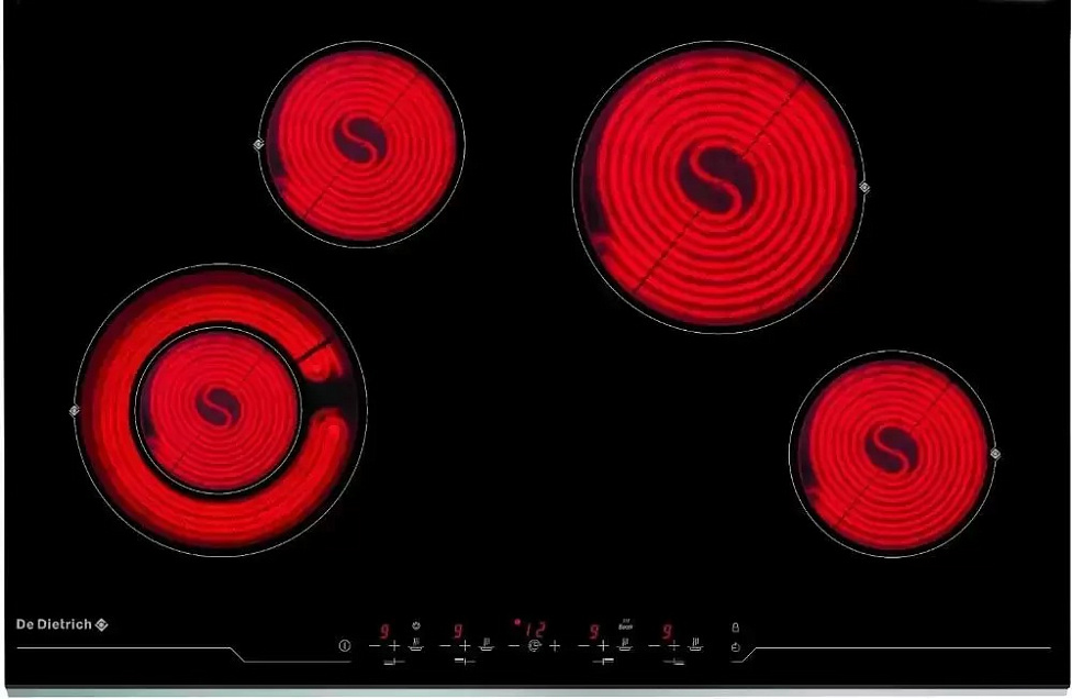 De Dietrich DTV 1118 X — электрическая варочная панель шириной 80 см. Модель выполнена из черной стеклокерамики, прочной и простой в уходе. Конфорка с функцией Booster оптимально подходит для ускоренного приготовления или подогрева пищи. Защита от перелива автоматически выключает нагревательную зону в случае попадания на нее жидкости.