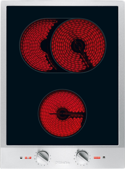 Miele CS 1122 E — узкая варочная поверхность в стальном обрамлении. Модель оборудована двумя конфорками типа Hi-Light, одна из которых имеет овальную зону расширения. В случае перегрева прибор отключается автоматически, что гарантирует его безопасную эксплуатацию.