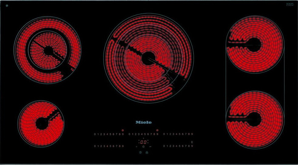 Еще одним технически совершенным решением среди варочных панелей, является модель Miele KM 5864. Это панель снабжена пятью керамическими конфорками, которые имеют различную мощность. Две конфорки нормальной мощности объединены общей зоной расширения. Такое расположение основных конфорок дает преимущество над остальными моделями варочных панелей. На центральной конфорке уместится посуда типа «Wok», а на крайних конфорках можно располагать блюда прямоугольной формы.