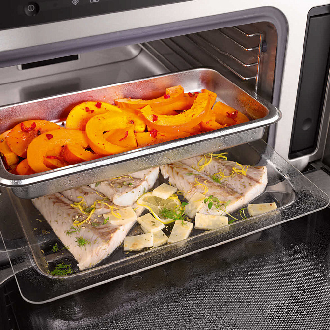 Решётка, Перфорированный противень, Неперфорированный противень, Съемные боковые направляющие, Легко снимаемые боковые решётки из нержавеющей стали, Стеклянная ёмкость, Кабель питания, Таблетки для удаления накипи