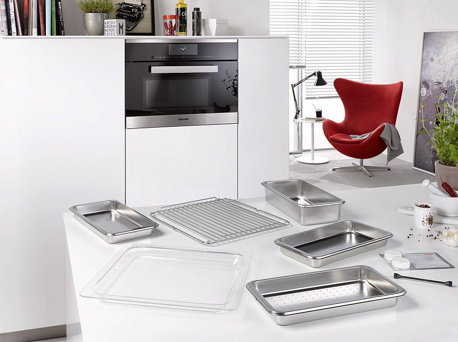 Решётка, Перфорированный противень, Неперфорированный противень, Съемные боковые направляющие, Легко снимаемые боковые решётки из нержавеющей стали, Стеклянная ёмкость, Кабель питания, Таблетки для удаления накипи
