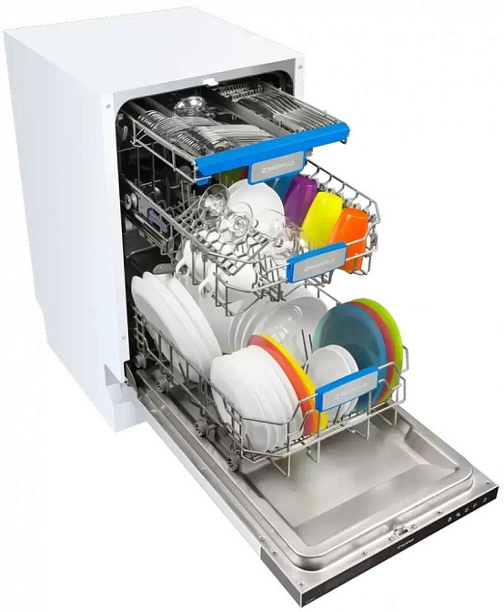 Посудомоечная машина, В комплекте: корзина для столовых приборов, сливной и заливной шланг, держатель для шланга, Сливной и заливной шланг, Специальные держатели для хрустальных бокалов