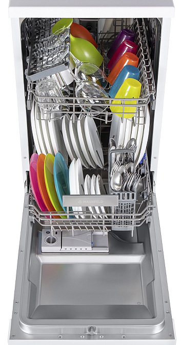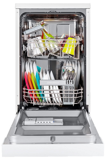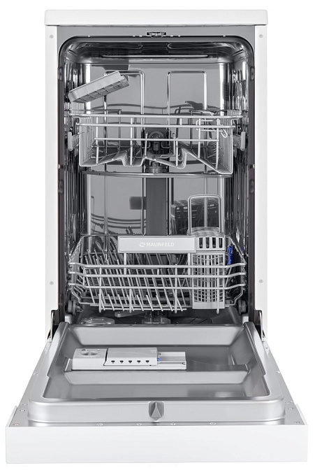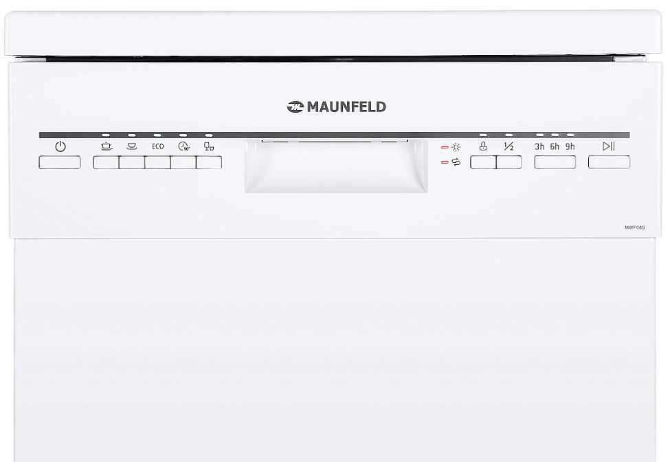 Посудомоечная машина MAUNFELD MWF08S станет надежной помощницей в выполнении рутинных кухонных задач. Модель с лаконичной белой расцветкой корпуса обладает хорошей вместительностью, равной 9 комплектам посуды. За один цикл работы машине потребуется 9.5 л водопроводной воды и 0.75 кВт/ч электроэнергии. Это указывает на ее экономичность и позволяет уменьшить счета за воду и электричество. Чтобы эффективно очистить въевшиеся загрязнения и минимизировать расход воды, вам достаточно подобрать одну из пяти программ работы. Имеется режим половинной загрузки, который поможет снизить расход воды и электроэнергии при неполной загрузке машины грязной посудой. Еще один плюс прибора заключается в наличии функции отложенного запуска, которая позволяет начать процесс очищения кухонных принадлежностей в установленные пользователем временные рамки.
