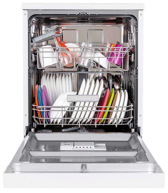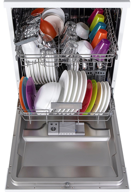 Посудомоечная машина MAUNFELD MWF12S вмещает до 12 комплектов столовых принадлежностей за раз, безупречно очищая их и расходуя при этом не больше 11.5 л воды. Такие показатели будут оптимальны для большой семьи. Прибор относится к отдельностоящему типу: это дает возможность установить устройство там, где это потребуется, не ориентируясь на положение, конструкцию или даже наличие кухонного гарнитура. В сочетании с классом энергоэффективности А+ это делает ее чрезвычайно экономичной. Счета за воду и электричество существенно уменьшатся с использованием этого прибора, что не может не радовать владельца. При этом модель имеет 5 программ мытья. Высокому уровня комфорта использования устройства способствует наличие индикатора наличия соли и индикатора наличия ополаскивателя, которые напоминают пользователю о необходимости пополнения резервуаров.