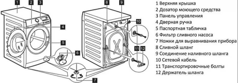 Стиральная машина, Шланг подачи воды, Сливной шланг, Держатель шланга, Сетевой кабель, Заглушка, Инструкция