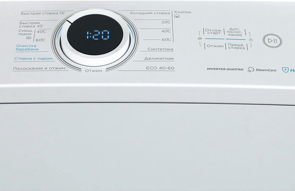 Стирка изделий из хлопка, Синтетика, Стирка деликатных тканей, Экономичная стирка, Быстрая стирка, Стирка смешанных тканей, Стирка с паром, Полоскание, Отжим