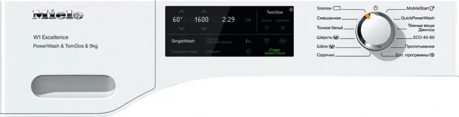 Стирка смешанных тканей, Синтетика, Автоматическая +, Стирка изделий из хлопка, Стирка изделий из хлопка Eco, Стирка изделий из хлопка Гигиена, Стирка деликатных тканей, Тонкое белье, Сорочки, Стирка изделий из шелка, Ручная стирка, Стирка изделий из шерсти/Ручная стирка, Экспресс 20, Темные вещи, Джинсы, Верхняя одежда, Пропитывание, Спортивное белье, Перины, Подушки, Пуховики, Гардины, Легкое разглаживание, Очистка машины, Новые вещи, Полоскание, Накрахмаливание, Слив, Отжим, Стирка одной вещи SingleWash, ECO 40–60, Особенно тихо, Стирка при низкой температуре, AllergoWash