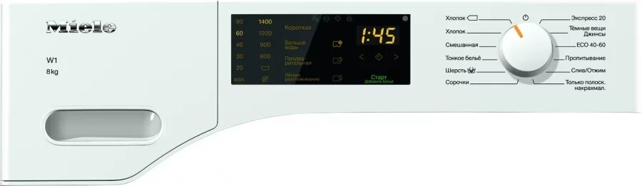 Стирка смешанных тканей, Синтетика, Стирка изделий из хлопка, Стирка изделий из хлопка Eco, Тонкое белье, Сорочки, Стирка изделий из шерсти/Ручная стирка, Экспресс 20, Темные вещи, Джинсы, Пропитывание, Легкое разглаживание, Полоскание, Накрахмаливание, Слив, Отжим, ECO 40–60, Стирка при низкой температуре