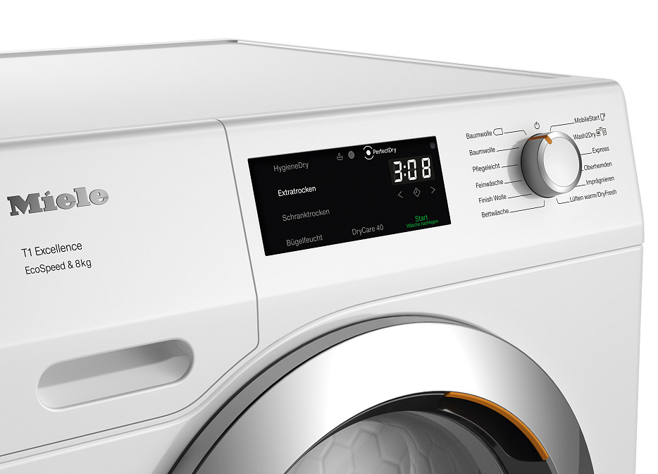 Технология Wash2Dry: автоматическая синхронизация с программой стиральной машины Miele, Функция AddLoad (дозагрузка белья), Функция EcoSpeed, Функция дозагрузки, Функция объединения в сеть Miele@home, управление DirectSensor