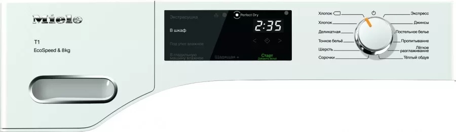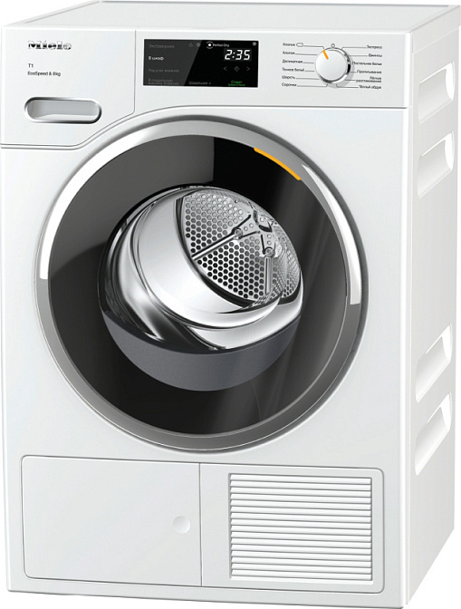 Элегантное устройство цвета «белый лотос» дополнено дверцей оттенка «чёрный обсидиан» с хромированной окантовкой. Выбирать программу работы еще удобнее с наклонной на 5° панелью управления. Таймер позволяет установить время запуска с отсрочкой до 24 часов. Контролировать работу прибора помогут индикаторы остаточного времени, заполнения емкости для конденсата и необходимости очистки фильтра. Экономичный двигатель ProfiEco отличается пониженным уровнем шума и вибраций. Большой ворсовый фильтр размещается в передней части устройства и благодаря этому легко выдвигается для очистки. Компрессор HeatPump без отвода нагретого воздуха за пределы помещения бережно высушивает любые ткани. Функция дозагрузки белья AddLoad прервет выполнение программы, а затем продолжит с сохранением настроек. Белье можно ароматизировать с функцией FragranceDos, выбирая при этом интенсивность аромата. Барабан из нержавеющей стали имеет сотовую структуру, благодаря которой белье скользит по поверхности и намного меньше изнашивается. Реверсивное вращение не позволяет белью сбиваться в ком. Для деликатных тканей предусмотрена щадящая сушка при низкой температуре.