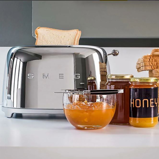 Дизайн: стиль 50-х годов, Цвет основания: полированный хром, Цвет верхней панели: полированный хром, 1 панель управления, Материал поддона для крошек: полированная нержавеющая сталь, Материал рычага: нержавеющая сталь, Материал кнопок / переключателя: пластик, Кнопки с подсветкой, Подсветка поворотного переключателя, Тип вилки электропитания: Euro, Автоматическое выбрасывание тостов, Приобретается отдельно: TSSR01 – держатель для сэндвичей (2 шт.); TSBW01 – решетка для подогрева булочек (1 шт.)