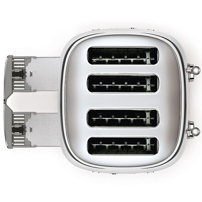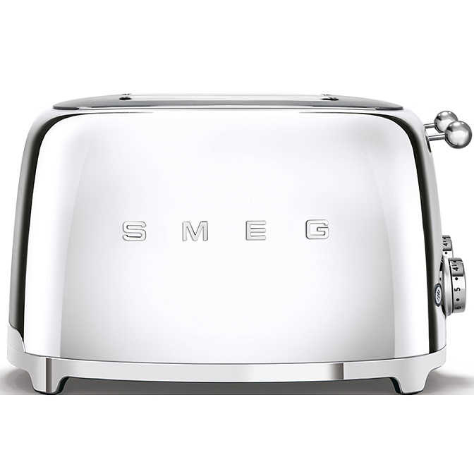 Дизайн: стиль 50-х годов, Цвет основания: полированный хром, Цвет верхней панели: полированный хром, 2 независимые панели управления, 2 поддона для крошек, Материал поддона для крошек: полированная нержавеющая сталь, Материал рычага: нержавеющая сталь, Материал кнопок / переключателя: пластик, Кнопки с подсветкой, Подсветка поворотного переключателя, Тип вилки электропитания: Euro, Автоматическое выбрасывание тостов, Приобретается отдельно: TSSR01 – держатель для сэндвичей (2 шт.); TSBW01 – решетка для подогрева булочек (1 шт.)