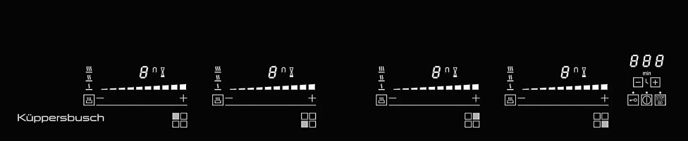 Регулировка мощности glideControl с белыми индикаторами, Ступень плавления 42°C, Ступень поддержания тепла 70°C, Ступень приготовления пасты 94°С, Автоматическая функция объединения ближней и дальней зон или всех зон в одну, Хромированная разметка, Режим гриля (для FlexiGrill акс. 1303), 4 уровня мощности ökopower