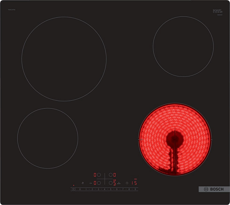 Электрическая варочная поверхность Bosch PKE611FP2E снабжена 4 конфорками. Тип нагревательных зон — электрические hi-light. Высота модели составляет 4.5 см, ширина — 59.2 см, глубина — 52.2 см. Материал поверхности — стеклокерамика, благодаря чему она легко очищается от жирного налета и других загрязнений. Комфортную эксплуатацию прибора гарантирует сенсорное управление. Также здесь есть таймер с отключением, защитное отключение. Основной цвет данного устройства — черный, что служит его сочетанию с кухонным интерьером в любом стиле: от современного до ретро и классики. Универсальный дизайн и независимый тип установки обеспечивают гибкие условия монтажа этой варочной панели.