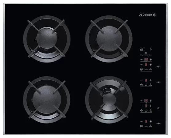 Варочная поверхность De Dietrich DTG 720 X — это независимая газовая модель с четырьмя конфорками, выполненная из стеклокерамики в черном цвете с решетками из чугуна. Управление сенсорное с сенсорными переключателями TouchControl расположено справа.