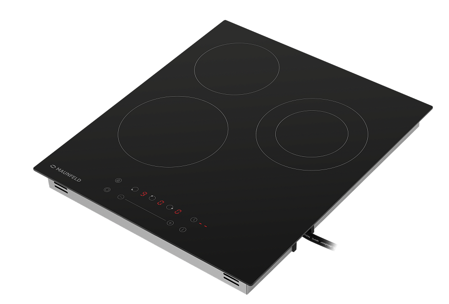 У средней конфорки есть зона расширения нагрева, что позволяет устанавливать на ней крупногабаритные кастрюли и сковородки. Маунфилд EVCE453DBK имеет 9 уровней мощности, а в случае попадания на поверхность большого количества жидкости все элементы автоматически блокируются. Для безопасности пользователя у прибора есть индикация для остаточного тепла. А также в набор автоматически встроенных программ устройства включен таймер с функцией отключения. Он подаст звуковой сигнал по окончании готовки.