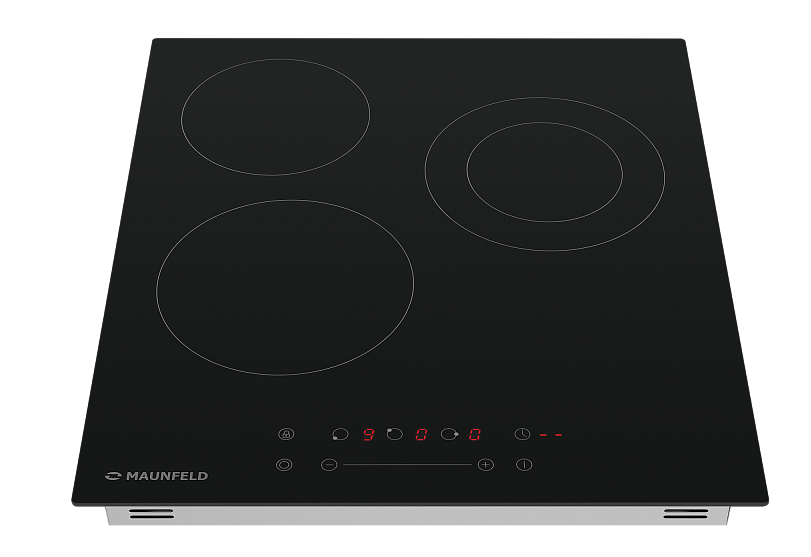У средней конфорки есть зона расширения нагрева, что позволяет устанавливать на ней крупногабаритные кастрюли и сковородки. Маунфилд EVCE453DBK имеет 9 уровней мощности, а в случае попадания на поверхность большого количества жидкости все элементы автоматически блокируются. Для безопасности пользователя у прибора есть индикация для остаточного тепла. А также в набор автоматически встроенных программ устройства включен таймер с функцией отключения. Он подаст звуковой сигнал по окончании готовки.