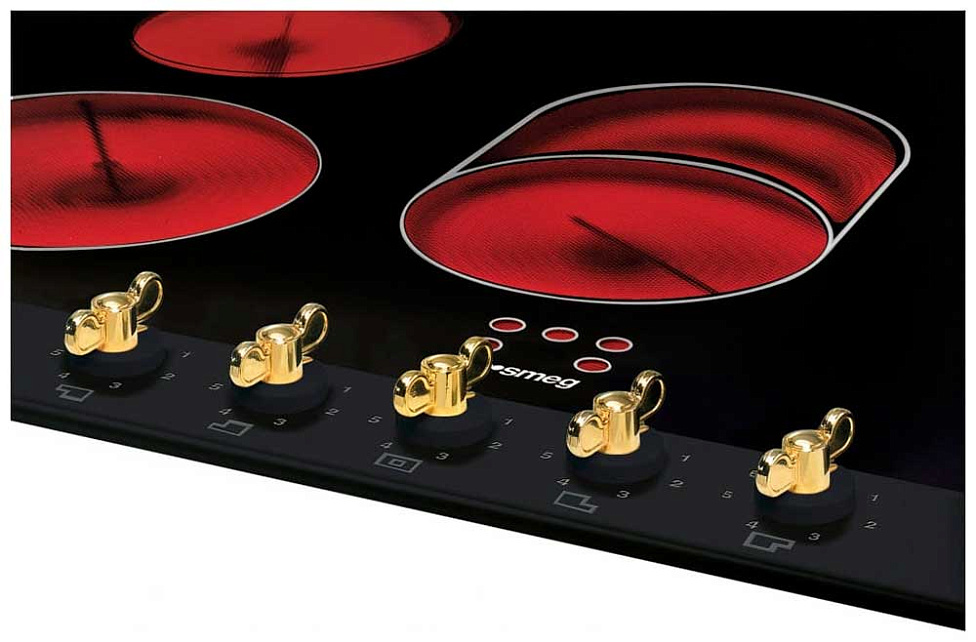 Варочная поверхность Smeg P875AO Coloniale снабжена 5 конфорками. Тип нагревательных зон — электрические hi-light. Благодаря особенностям своей конструкции они гораздо эффективнее, чем обычные чугунные. Эти нагревательные элементы достигают заданной температуры в течение 3-7 секунд. Такая скорость позволяет существенно сэкономить время при приготовлении пищи. Высота прибора составляет 4.7 см, ширина — 71.8 см, глубина — 51 см. Модель выполнена из особо прочной и термостойкой стеклокерамики. Этот материал прекрасно выглядит благодаря своей гладкой глянцевой поверхности. Он легко очищается от жирного налета и других загрязнений.