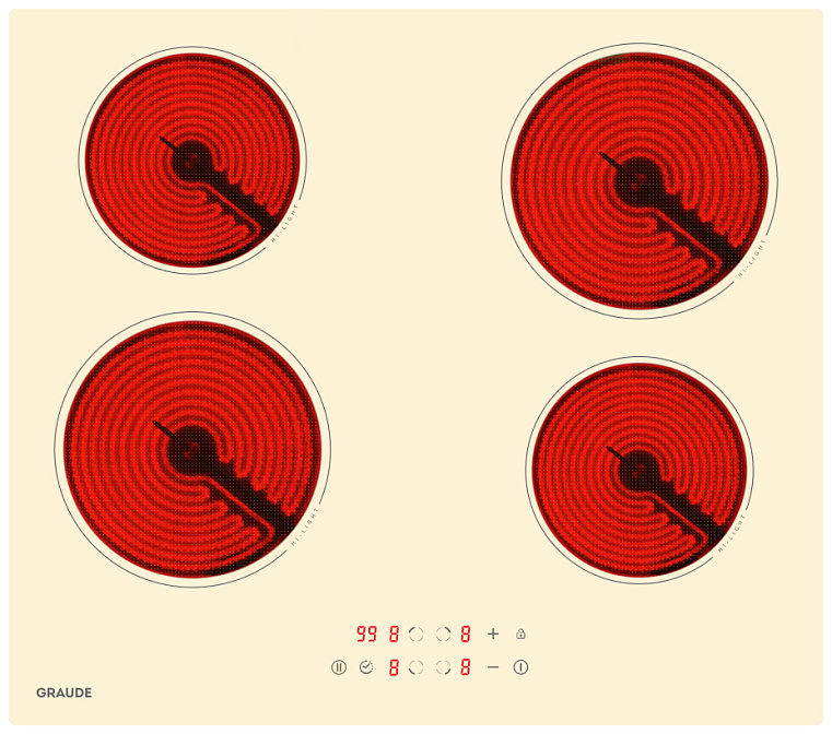 Основной цвет данного устройства — бежевый, что служит его сочетанию с кухонным интерьером в любом стиле: от современного до ретро и классики. Кроме того, светлые оттенки являются наиболее практичными, так как на них менее заметны разводы или следы от рук. Универсальный дизайн и независимый тип установки обеспечивают гибкие условия монтажа этой варочной панели. Варочная панель Грауде EK 60.0 C отличается высоким уровнем безопасности. Например, модель оборудована функцией защитного отключения и защитой от детей (блокировкой панели управления). Тихая работа не создает дискомфорт.
