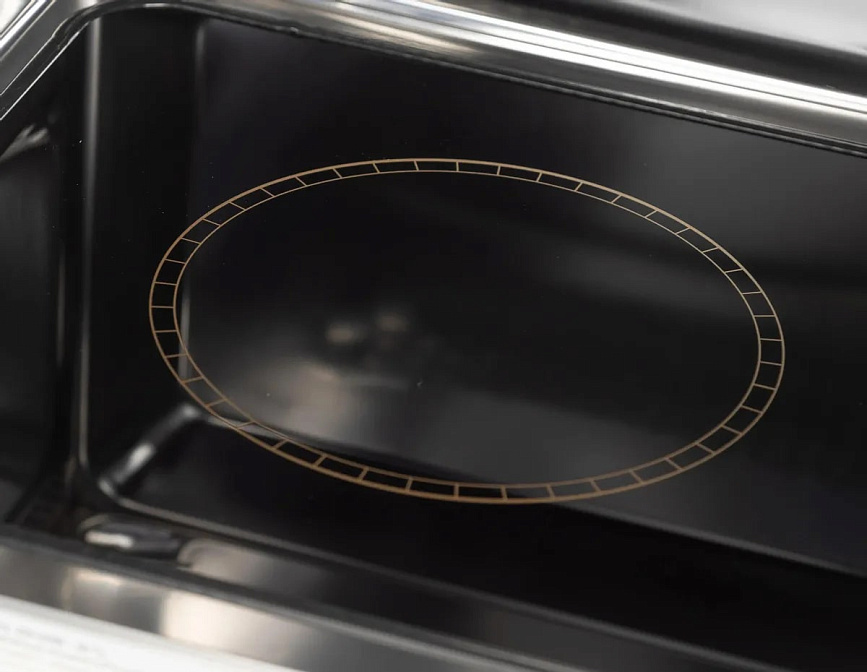 Данная техника не предполагает наличия стеклянного поворотного столика. Дно рабочей камеры покрыто специальной керамической пластиной, что увеличивает полезное пространство и позволяет готовить несколько блюд одновременно. Гладкую и ровную поверхность гораздо проще очищать, что тоже является преимуществом. Благодаря современной технологии распределения микроволн 360°StirTechnology пища готовится значительно быстрее и получается невероятно вкусной. Предусмотрена блокировка работы при открытой дверце. В комплекте с устройством поставляется металлическая решетка.