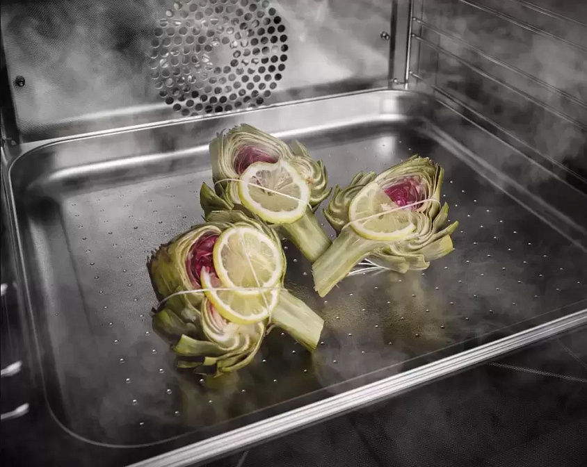 В данной модели работает принцип комбинированного приготовления: это значит, что помимо стандартных режимов с паром вы можете использовать нагрев, характерный для духовых шкафов. Благодаря такой технологии легко получить нежные овощи, сочное мясо, пышную выпечку и настраивать индивидуальные параметры, чтобы добиться идеального результата. Пусть вас не пугает количество программ и настроек — электронная панель управления с возможностью выбора режимов и индикацией процесса понятна пользователям любого возраста. Для удобства производители установили следующие индикаторы: текущего времени, фактической температуры, заданной температуры, рекомендуемой температуры, даты. Вы можете включить таймер, который сделает работу с прибором еще комфортнее.